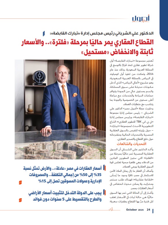 وحاورت مجلة «أصول مصر» الدكتور علي الشرباني – رئيس مجلس إدارة مجموعة «تبارك القابضة»، ورئيس مجلس إدارة «تي بي كي TBK للتطوير العقاري»؛ الذراع التطويرية الأحدث لمجموعة «تبارك» – حول رؤيته للفرص بالسوق العقارية المصرية والتحديات الحالية ومقترحاته حول دفع القطاع والتصدير العقاري.