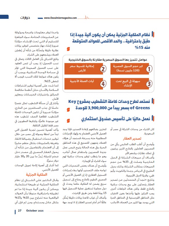 وأشار إلى أنه في مصر يمكن للمستثمر الحصول على الأرض بنظام التقسيط، بينما في الخليج يجب أن يتم دفع ثمن الأرض نقدًا، كما تتميز السوق المصرية بسهولة أكبر في البيع والتحصيل؛ إذ يُقبِل العملاء على الشراء بالتقسيط، بينما يظل البيع النقدي هو الغالب في الخليج.