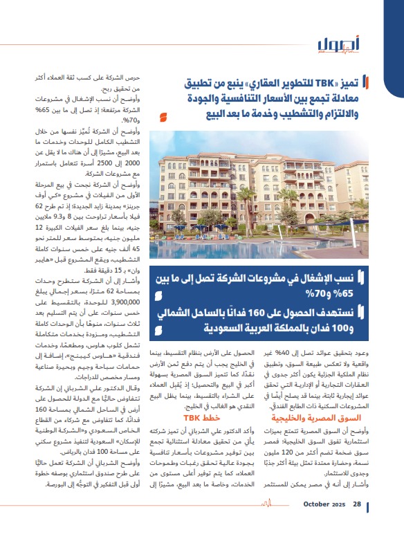 تميز «TBK للتطوير العقاري» ينبع من تطبيق معادلة تجمع بين الأسعار التنافسية والجودة والالتزام والتشطيب وخدمة ما بعد البيع