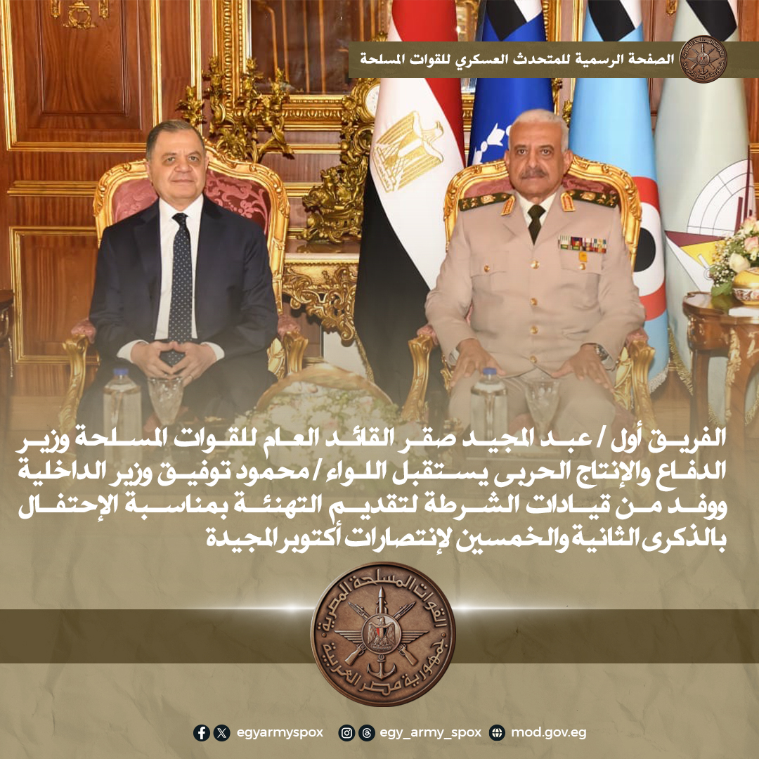 إستقبل الفريق أول عبد المجيد صقر القائد العام للقوات المسلحة وزير الدفاع والإنتاج الحربى اللواء / محمود توفيق وزير الداخلية على رأس وفد من قيادات وزارة الداخلية لتقديم التهنئة للقوات المسلحة بمناسبة الإحتفال بالذكرى الثانية والخمسين لإنتصارات أكتوبر المجيدة ، وذلك بحضور الفريق / أحمد خليفة رئيس أركان حرب القوات المسلحة وعدد من قادة القوات المسلحة .