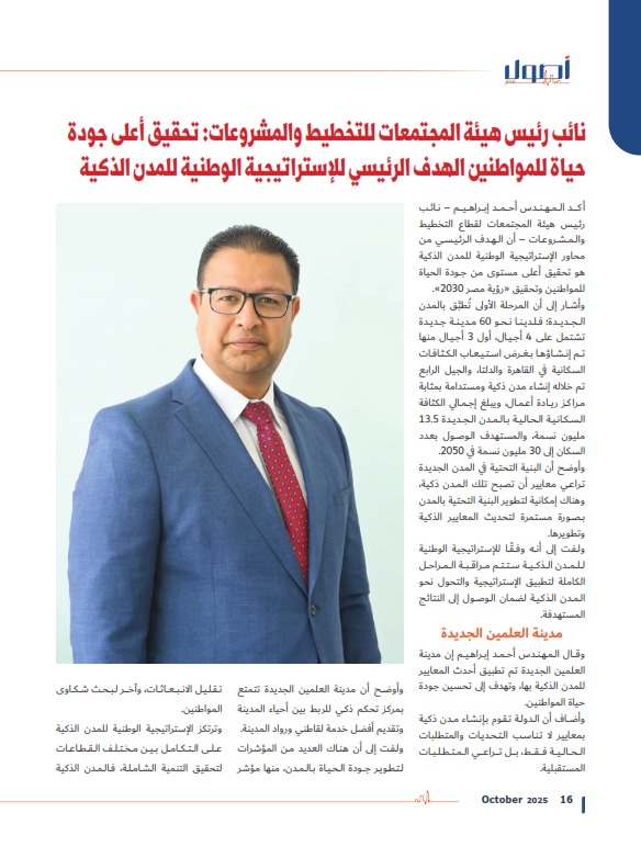 نائب رئيس هيئة المجتمعات للتخطيط والمشروعات: تحقيق أعلى جودة حياة للمواطنين الهدف الرئيسي للإستراتيجية الوطنية للمدن الذكية