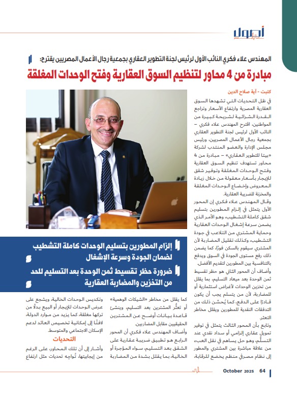 في ظل التحديات التي تشهدها السوق العقارية المصرية وارتفاع الأسعار وتراجع القدرة الشرائية لشريحة كبيرة من المواطنين، اقترح المهندس علاء فكري – النائب الأول لرئيس لجنة التطوير العقاري بجمعية رجال الأعمال المصريين، ورئيس مجلس الإدارة والعضو المنتدب لشركة «بيتا للتطوير العقاري» – مبادرة من 4 محاور تستهدف تنظيم السوق العقارية وفتح الوحدات المغلقة وتوفير شقق للإيجار بأسعار معقولة من خلال زيادة المعروض وإخضاع الوحدات المغلقة والمخزنة للضريبة العقارية.