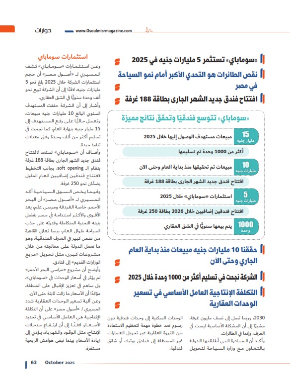 وعن استثمارات «سوماباي» كشف المسيري لـ «أصول مصر» أن حجم استثمارات الشركة خلال 2025 بلغ نحو 5 مليارات جنيه، لافتًا إلى أن الشركة تبيع نحو ألف وحدة سنويًّا في الشق العقاري.