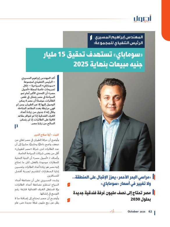 أكد المهندس إبراهيم المسيري – الرئيس التنفيذي لمجموعة «سوماباي» السياحية – خلال تصريحات خاصة لمجلة «أصول مصر» أن التحدي الأكبر أمام نمو السياحة في مصر يتمثل في نقص الطائرات، موضحًا أن مصر لا يمكن الوصول إليها إلا عبر الطيران، ومن ثم فهي مرتبطة بعدد المقاعد المتاحة، وقال إنه لا جدوى من زيادة أعداد الغرف الفندقية إذا لم تتوافر مقاعد كافية على الطائرات، إذ لن يتمكن السائح من زيارة مصر.