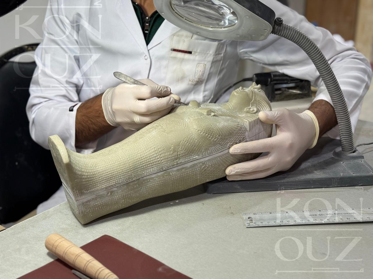 وأوضح اللواء هشام شعراوي رئيس مجلس إدارة شركة كنوز مصر للنماذج الأثرية، أن تصميم الدعوة مر بعدة مراحل دقيقة تعكس حساسية العمل الفني المُستمد من إرث مصر الحضاري، بدأت العملية من قسم النحت، حيث تولّى الفنانون تجسيد الزخارف والرموز والكتابات الهيروغليفية بدقة التماثل الأصلية، ثم انتقلت إلى مراحل الاستنساخ فـالتذهيب فـالتلوين، قبل أن يُغلّف التابوت من الداخل بقماش المخمل الفاخر، لتظهر في صورتها النهائية التي تليق بعظمة الاحتفالية ومكانة المتحف.