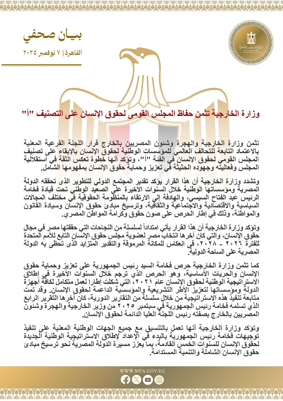 تُثمن وزارة الخارجية والهجرة وشؤون المصريين بالخارج، قرار اللجنة الفرعية المعنية بالاعتماد التابعة للتحالف العالمي للمؤسسات الوطنية لحقوق الإنسان بالإبقاء على تصنيف المجلس القومي لحقوق الإنسان في الفئة "أ"، وتؤكد أنها خطوة تعكس الثقة في استقلالية المجلس وفاعليته وجهوده الحثيثة في تعزيز وحماية حقوق الإنسان بمفهومها الشامل.