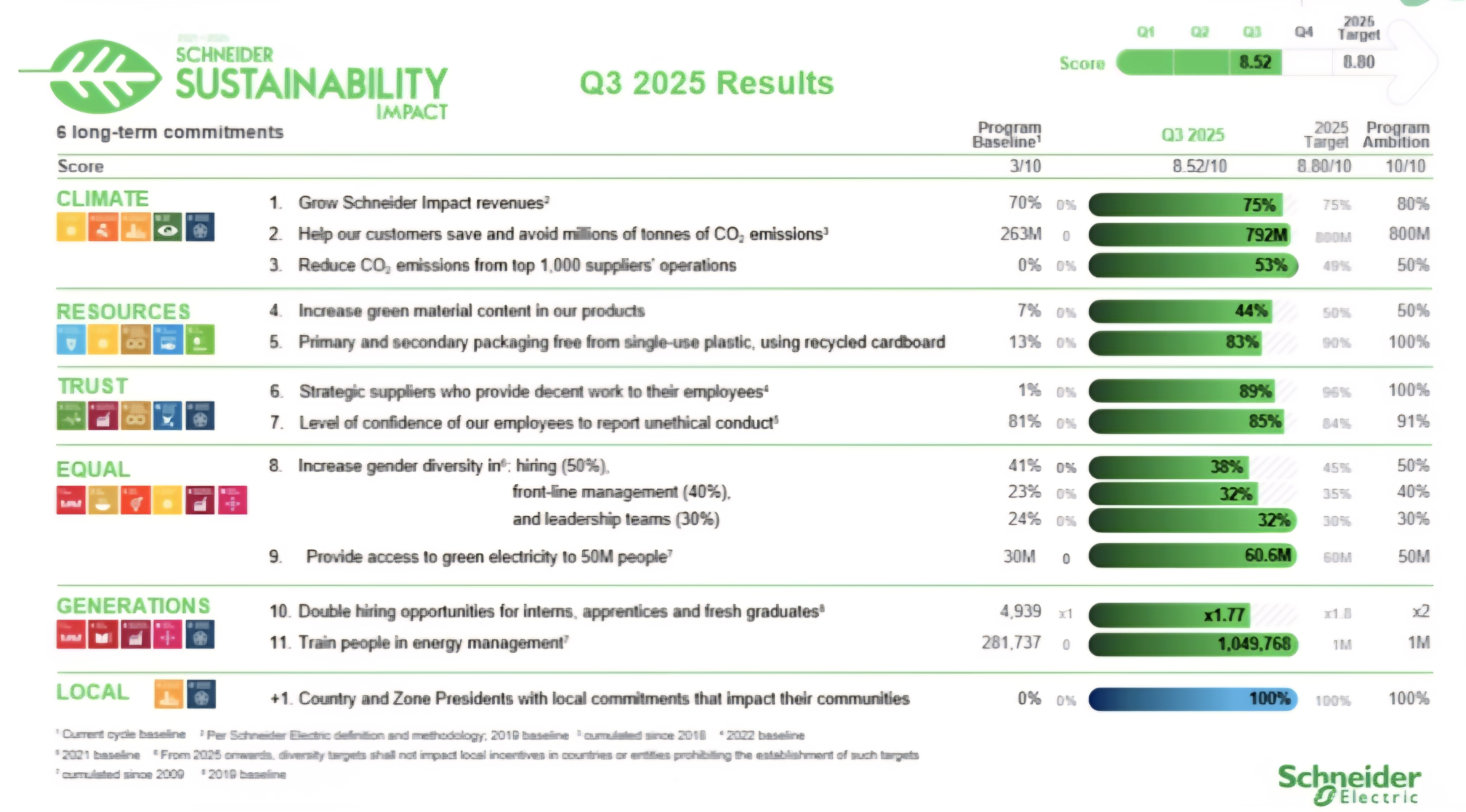 أعلنت شركة شنايدر إلكتريك، الرائدة في التحول الرقمي لإدارة الطاقة والأتمتة، عن نتائجها غير المالية للربع الثالث من عام 2025، مؤكدةً بذلك استمرار تقدمها نحو تحقيق أهداف برنامج "تأثير شنايدر للاستدامة" (SSI) 2021- 2025. ومع تبقّي ثلاثة أشهر فقط على نهاية البرنامج، سجّلت الشركة هذا الربع معدل أداء بلغ 8.52 من 10، بما يعكس توافقًا قويًا مع هدفها المحدد لنهاية العام عند 8.80.