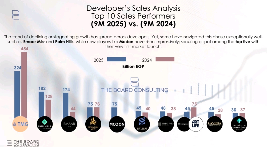 كشف تقرير ذا بورد كونسالتنج لأداء أفضل 10 مطورين عقاريين في مصر خلال الأشهر التسعة الأولى من عام 2025، مقارنة بالفترة نفسها من عام 2024، عن تباين كبير في النتائج، مؤكدًا أن السوق يشهد مرحلة "فلترة" تتطلب استراتيجيات مرنة ومبتكرة.