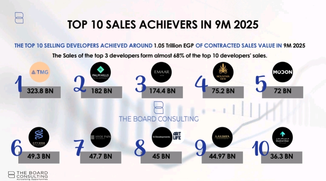 كشف تقرير حديث صادر عن "ذا بورد كونسالتنج" عن الأداء القياسي لأفضل 10 مطورين عقاريين في مصر خلال أول 9 أشهر من عام 2025، حيث بلغ إجمالي قيمة مبيعاتهم التعاقدية حوالي 1.05 تريليون جنيه مصري. ويؤكد هذا الرقم الضخم على استمرار قوة القطاع العقاري كقاطرة للاقتصاد، رغم التحديات التي يواجهها السوق.