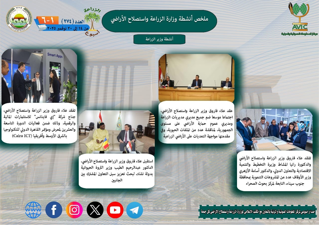 كما عقد علاء فاروق وزير الزراعة واستصلاح الأراضي، اجتماعا موسعا ضم جميع مديري مديريات الزراعة ومديري عموم حماية الأراضي على مستوى الجمهورية، لمناقشة عدد من الملفات الحيوية، وفي مقدمتها مواجهة التعديات على الأراضي الزراعية، كذلك استقبل فاروق، الدكتور عبدالرحيم الطيب وزير الثروة الحيوانية بدولة تشاد، لبحث تعزيز سبل التعاون المشترك بين الجانبين، كما تفقد وزير الزراعة، جناح شركة "إي فاينانس" للاستثمارات المالية والرقمية، وذلك ضمن فعاليات الدورة التاسعة والعشرين لمعرض ومؤتمر القاهرة الدولي للتكنولوجيا بالشرق الأوسط وأفريقيا (Cairo ICT)