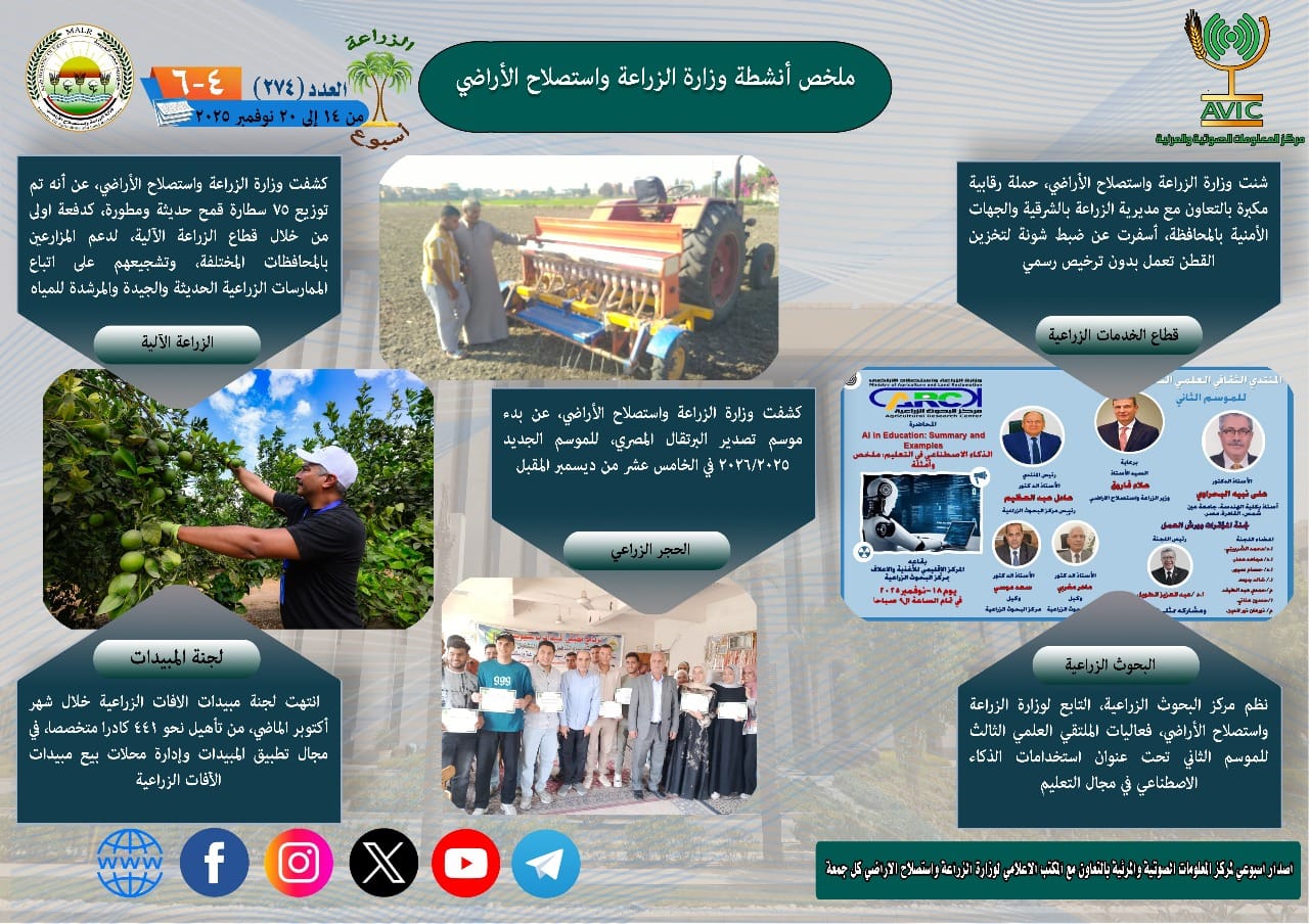 أصدر مركز المعلومات الصوتية والمرئية بوزارة الزراعة واستصلاح الأراضي، "الانفوجراف الاسبوعي" في نسخته رقم 274 حول الحصاد الاسبوعي لأهم أنشطة الوزارة، خلال الاسبوع الماضي في الفترة من 14 وحتى 20 نوفمبر الجاري، كما أصدر المركز ايضا ملخصا بالفيديو، حول انشطة الوزارة خلال نفس الفترة.