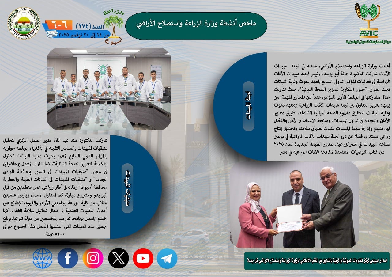 بينما تلقى علاء فاروق وزير الزراعة واستصلاح الأراضي، تقريرا مفصلا من المهندس محمد الخطيب المدير التنفيذي للهيئة العامة للإصلاح الزراعي، استعرض خلاله أبرز جهود وأنشطة الهيئة خلال شهر أكتوبر الماضي، كما افتتح معهد بحوث وقاية النباتات، التابع لمركز البحوث الزراعية، فعاليات المؤتمر الدولي السابع تحت شعار "حلول ابتكارية لتعزيز الصحة النباتية"، كذلك نظم المعمل المركزي لتحليل متبقيات المبيدات والعناصر الثقيلة في الأغذية، التابع لمركز البحوث الزراعية، برنامجا تدريبيا متخصصا حول الكشف عن غش عسل النحل، لعدد من الكيميائيين العاملين في مصانع العسل بمحافظة الغربية.