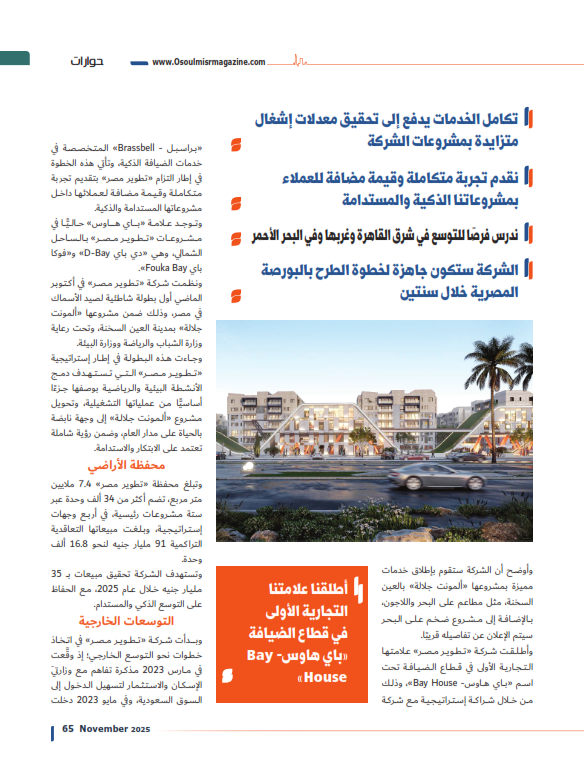 وأطلقت شركة «تطوير مصر» علامتها التجارية الأولى في قطاع الضيافة تحت اسم «باي هاوس- Bay House»، وذلك من خلال شراكة إستراتيجية مع شركة «براسبل - Brassbell» المتخصصة في خدمات الضيافة الذكية، وتأتي هذه الخطوة في إطار التزام «تطوير مصر» بتقديم تجربة متكاملة وقيمة مضافة لعملائها داخل مشروعاتها المستدامة والذكية.