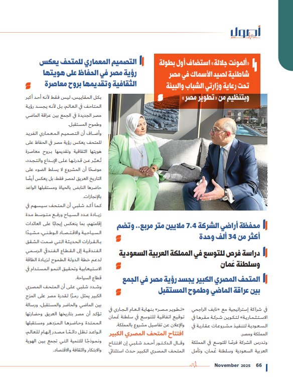 وأضاف أن التصميم المعماري الفريد للمتحف يعكس رؤية مصر في الحفاظ على هويتها الثقافية وتقديمها بروح معاصرة تُعبِّر عن قدرتها على الإبداع والتجدد، موضحًا أن المشروع لا يسلط الضوء على التاريخ العريق لمصر فقط، بل يعكس أيضًا حاضرها النابض بالحياة ومستقبلها الواعد بالإنجازات.