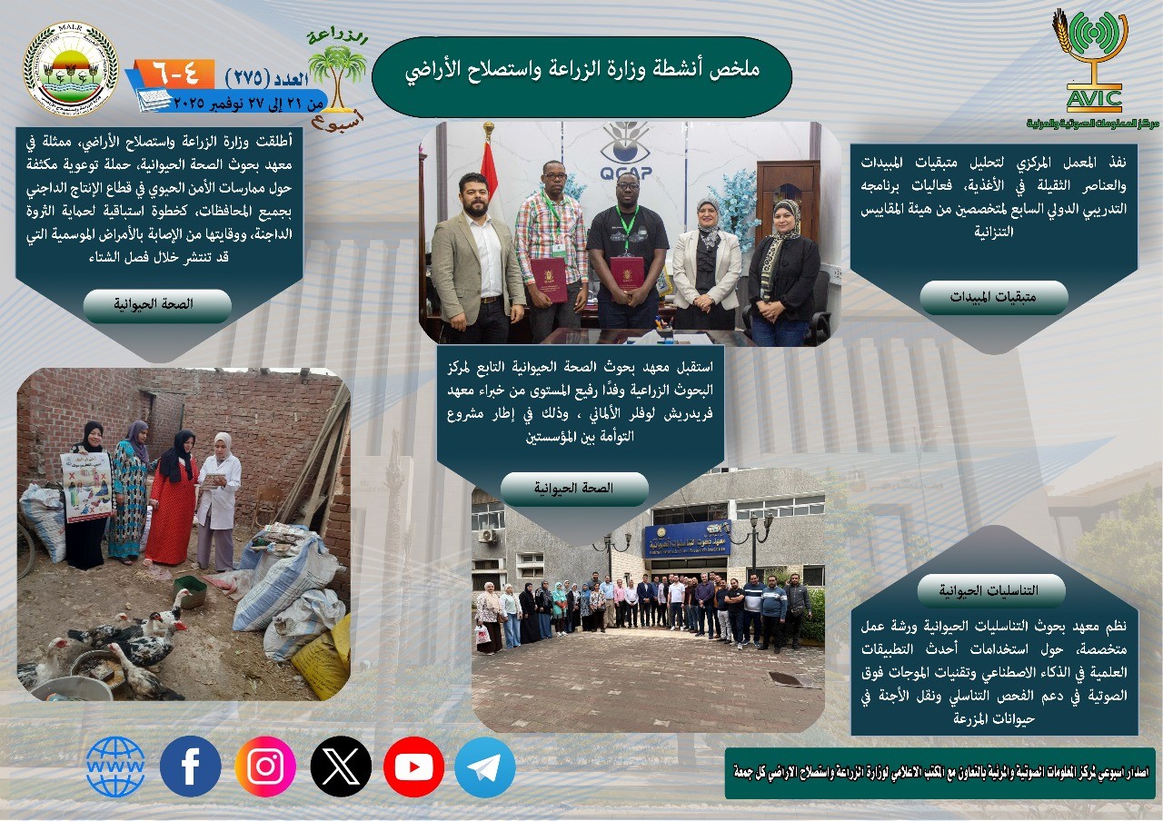 كما نفذ المعمل المركزي لتحليل متبقيات المبيدات والعناصر الثقيلة في الأغذية، فعاليات برنامجه التدريبي الدولي السابع لمتخصصين من هيئة المقاييس التنزانية، بينما أطلق معهد بحوث الصحة الحيوانية، حملة توعوية مكثفة حول ممارسات الأمن الحيوي في قطاع الإنتاج الداجني بجميع المحافظات، كخطوة استباقية لحماية الثروة الداجنة، ووقايتها من الإصابة بالأمراض الموسمية التي قد تنتشر خلال فصل الشتاء، واستقبل المعهد، وفدًا رفيع المستوى من خبراء معهد فريدريش لوفلر الألماني ، وذلك في إطار مشروع التوأمة بين المؤسستين.