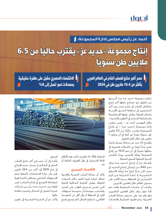 وأشار إلى أن مصر هي أكبر منتج للصلب الخام في العالم، إذ وصل حجم الإنتاج في عام 2024 إلى أكثر من 10.4 ملايين طن، وأن زيادة الاستثمارات المحلية ونمو الاستهلاك الداخلي يشكلان قاعدة قوية لمواصلة التوسع في إنتاج الصلب، ليس فقط من «حديد عز»، بل من شركات عديدة تعمل في المجال وتتميز بكفاءة عالية.