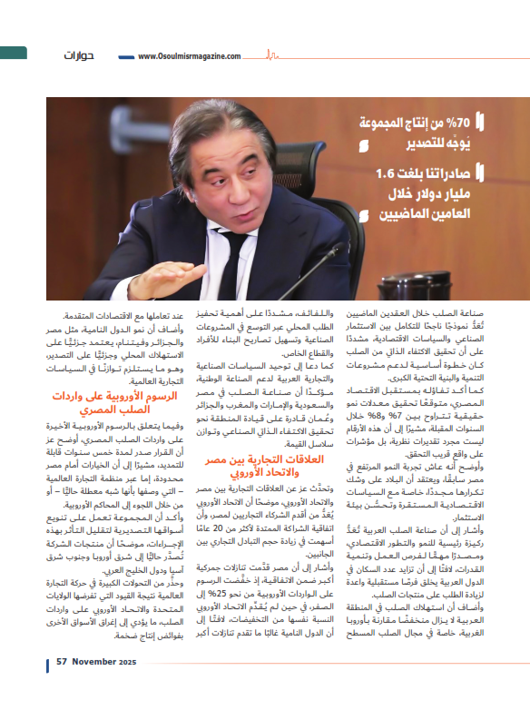 وأوضح أنه جزء من صناعة مصرية واعدة تضم عددًا كبيرًا من الشركات المتميزة في مجالها، مشيرًا إلى أن نحو 70% من إنتاج المجموعة يُوجَّه للتصدير، بينما تُخصَّص النسبة المتبقية للسوق المحلية.