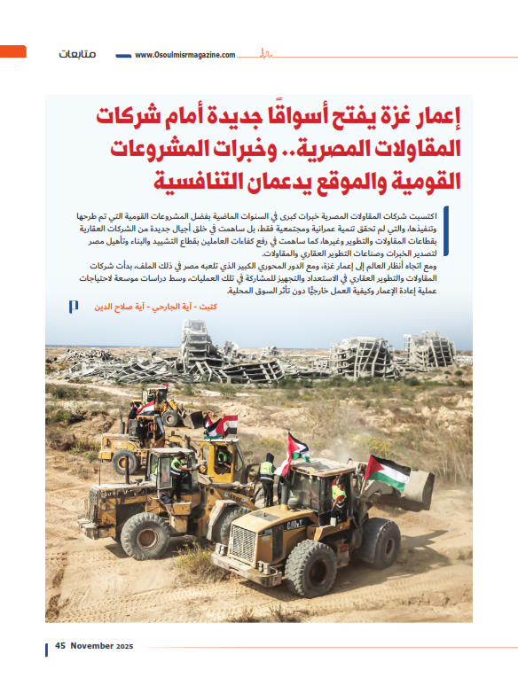 ومع اتجاه أنظار العالم إلى إعمار غزة، ومع الدور المحوري الكبير الذي تلعبه مصر في ذلك الملف، بدأت شركات المقاولات والتطوير العقاري في الاستعداد والتجهيز للمشاركة في تلك العمليات، وسط دراسات موسعة لاحتياجات عملية إعادة الإعمار وكيفية العمل خارجيًّا دون تأثر السوق المحلية.