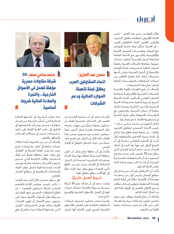 وقال المهندس حسن عبد العزيز – رئيس الاتحاد الإفريقي لمنظمات مقاولي التشييد، والرئيس الفخري لاتحاد المقاولين العرب – إن الاتحاد شكَّل لجنة خاصة للتواصل مع البنوك ومؤسسات التمويل العربية والإقليمية، بالتنسيق مع الأمانة العامة لجامعة الدول العربية، لتوفير خدمات تمويلية متكاملة للشركات العربية وتعبئة الموارد المالية لمشروعات إعادة الإعمار والتنمية في الدول العربية، وعلى رأسها مشروعات إعمار غزة، وتعزيز التعاون بين شركات المقاولات والمؤسسات المالية لضمان نجاح هذه المشروعات.
