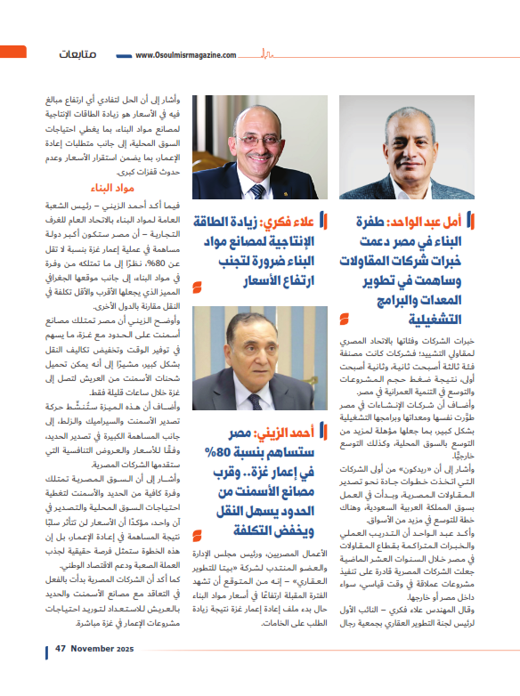 وقال المهندس علاء فكري – النائب الأول لرئيس لجنة التطوير العقاري بجمعية رجال الأعمال المصريين، ورئيس مجلس الإدارة والعضو المنتدب لشركة «بيتا للتطوير العقاري» – إنه من المتوقع أن تشهد الفترة المقبلة ارتفاعًا في أسعار مواد البناء حال بدء ملف إعادة إعمار غزة نتيجة زيادة الطلب على الخامات.