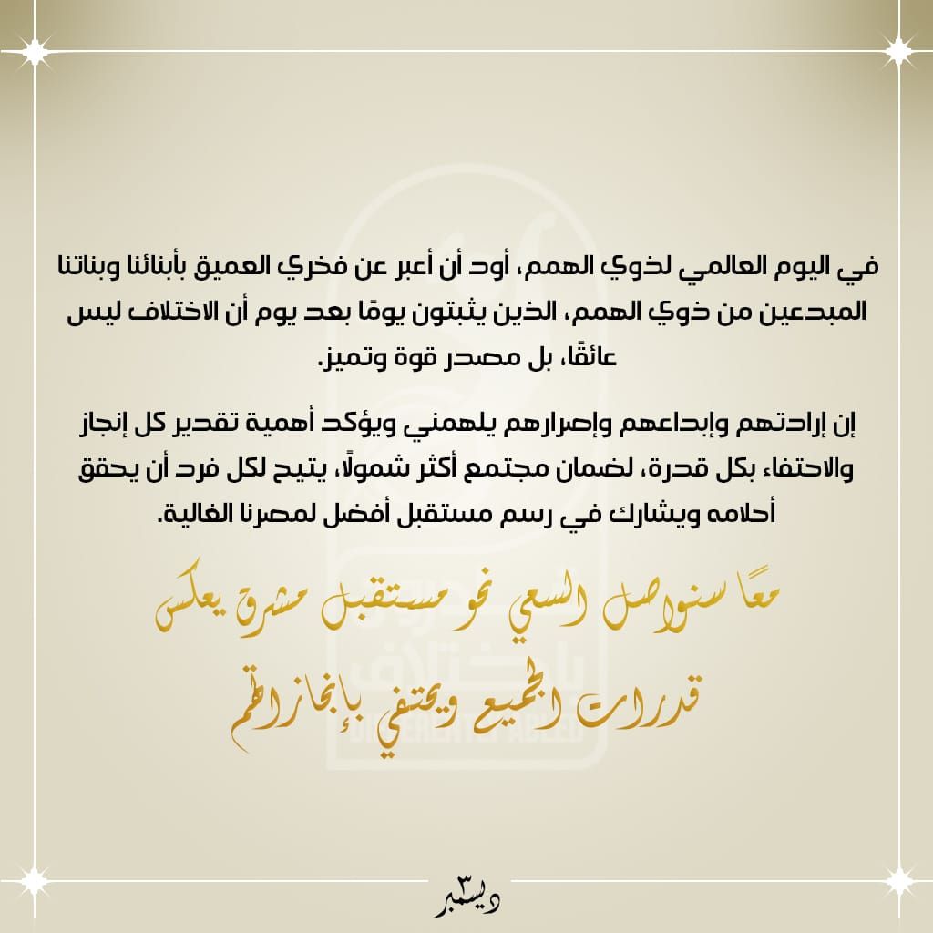 إن إرادتهم وإبداعهم وإصرارهم يلهمني ويؤكد أهمية تقدير كل إنجاز والاحتفاء به، بكل قدرة، لضمان مجتمع أكثر شمولا، يتيح لكل فرد أن يحقق أحلامه ويشارك في رسم مستقبل أفضل لمصرنا الغالية.