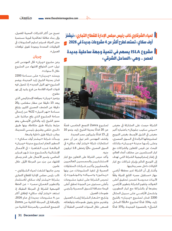 ومن جانبها كشفت لمياء الشرقاوي – نائب رئيس مجلس الإدارة للقطاع التجاري بشركة «نيشنز أوف سكاي للاستثمار والتطوير العمراني-مصر» – عن الخطة التوسعية للشركة في المرحلة المقبلة، إذ تستعد «نيشنز أوف سكاي» لإطلاق أكثر من 4 مشروعات جديدة في عام 2026، بالإضافة إلى المرحلة الثانية من Zomra التجمع الخامس، والمرحلة الثانية من «چريان نيشنز أوف سكاي».