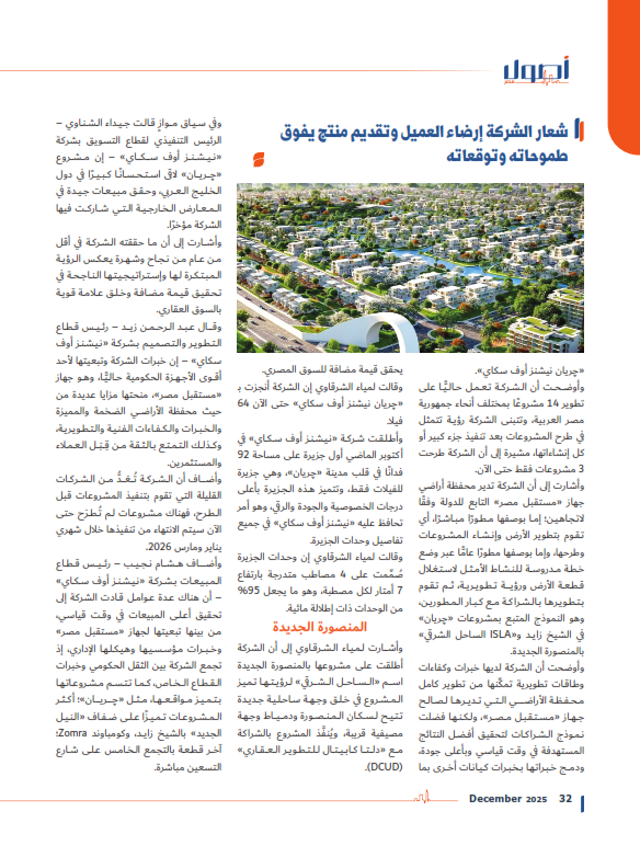وأضاف هشام نجيب – رئيس قطاع المبيعات بشركة «نيشنز أوف سكاي» – أن هناك عدة عوامل قادت الشركة إلى تحقيق أعلى المبيعات في وقت قياسي، من بينها تبعيتها لجهاز «مستقبل مصر» وخبرات مؤسسيها وهيكلها الإداري، إذ تجمع الشركة بين الثقل الحكومي وخبرات القطاع الخاص، كما تتسم مشروعاتها بتميز مواقعها، مثل «چريان»؛ أكثر المشروعات تميزًا على ضفاف «النيل الجديد» بالشيخ زايد، وكومباوند Zomra؛ آخر قطعة بالتجمع الخامس على شارع التسعين مباشرة.