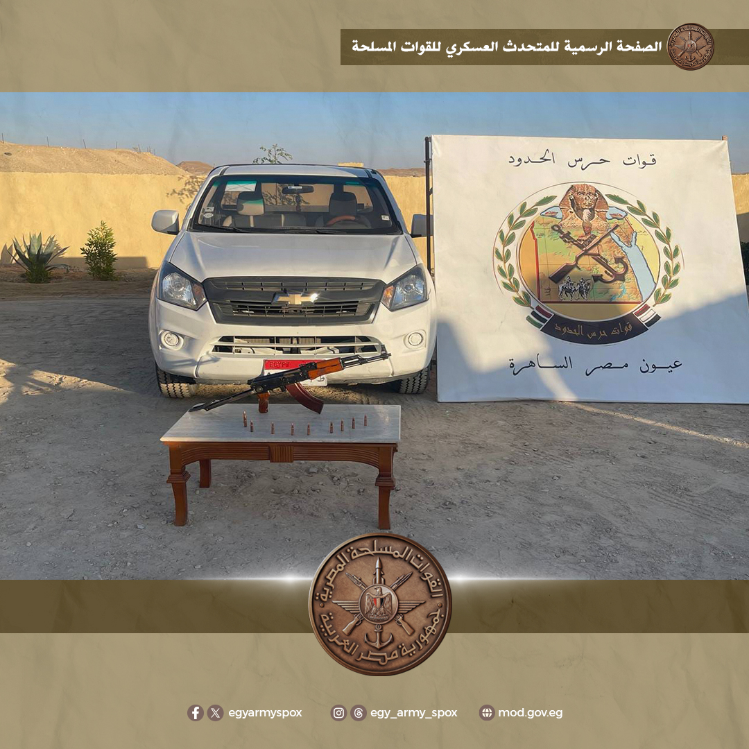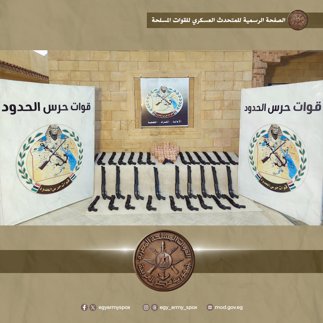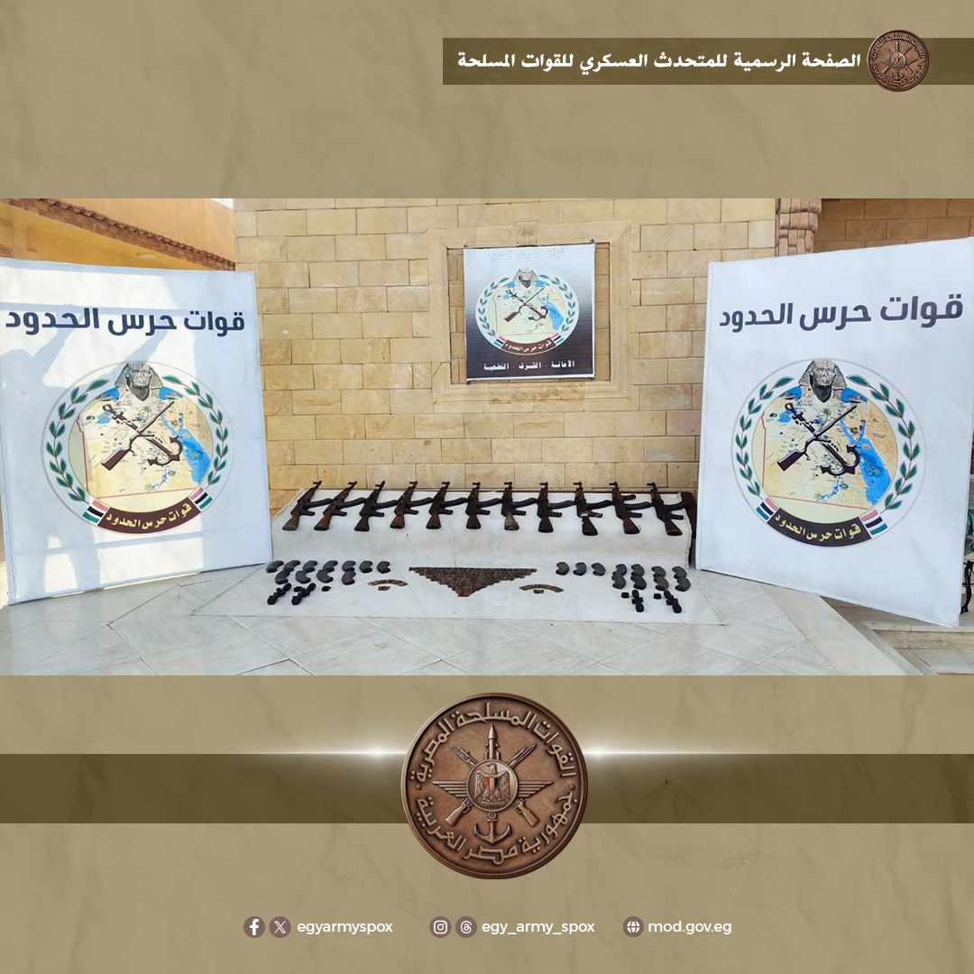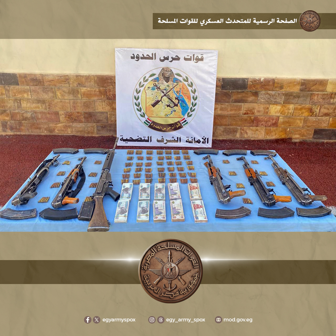 وفى توقيت متزامن نجحت قوات حرس الحدود على الإتجاه الإستراتيجى الغربى فى إحباط محاولات لتهريب كميات من الأسلحة والذخائر حيث تم ضبط عدد ( 11 ) بندقية آلية ، و( 30 ) بندقية خرطوش ، و( 1 ) مسدس و( 33 ) خزنة ، و( 4 ) تلسكوب وعدد ( 443 ) طلقة ، و( 12800 ) قرص مخدر .