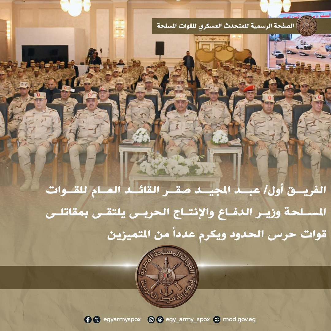 إلتقى الفريق أول عبدالمجيد صقر القائد العام للقوات المسلحة وزير الدفاع والإنتاج الحربى عدداً من مقاتلى قوات حرس الحدود ، والذى يأتى فى إطار حرص القيادة العامة للقوات المسلحة على التواصل المستمر مع أبنائها لتوحيد المفاهيم تجاه مختلف القضايا والموضوعات التى تتعلق بالأمن القومى المصرى ، وذلك بحضور الفريق / أحمد خليفة رئيس أركان حرب القوات المسلحة وعدد من قادة القوات المسلحة .