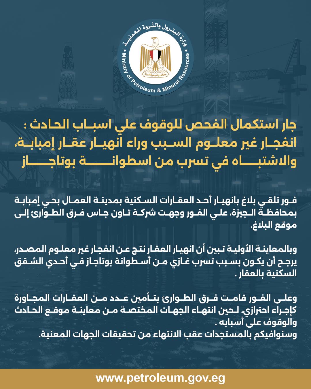 وزارة البترول تصدر بيان عاجل بشأن حادث انهيار عقار إمبابة