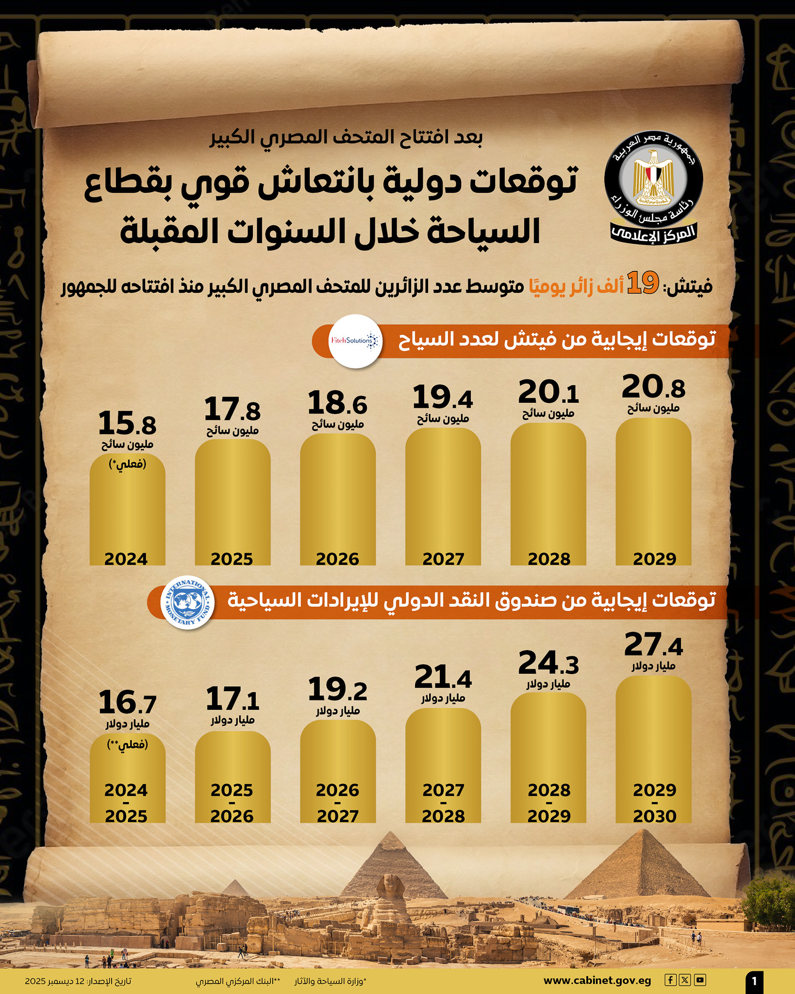 حيث أكدت وكالة "فيتش" أن متوسط عدد زوار المتحف المصري الكبير بلغ نحو 19 ألف زائر يوميًا، متوقعة أن يستقبل ما يصل إلى 7 ملايين زائر سنويًا، فيما توقعت "بلومبرج" أن يستقبل المتحف أكثر من 5 ملايين زائر سنويًا، بينما أشارت "ناشيونال جيوغرافيك" إلى أن الدعاية للمتحف ساهمت في زيادة الحجوزات السياحية لعام 2026.