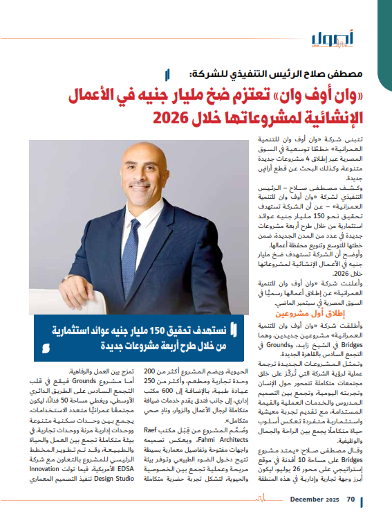 مصطفى صلاح : وان أوف وان تعتزم ضخ مليار جنيه في الأعمال الإنشائية لمشروعاتها خلال 2026
