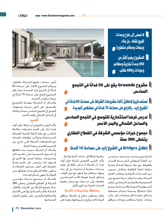 وأكد الرئيس التنفيذي أن شركة «وان أوف وان» تركز على تقديم مشروعات متكاملة تتماشى مع رؤية الدولة للتنمية العمرانية المستدامة، وتواكب تطلعات العملاء نحو المجتمعات الحديثة التي تمزج بين التصميم العصري وجودة الحياة.