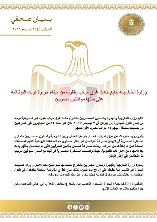 تتابع وزارة الخارجية والهجرة وشئون المصريين بالخارج حادث غرق مركب هجرة غير شرعية توجه من إحدى الدول المجاورة إلى اليونان في ٧ ديسمبر ٢٠٢٥، كان على متنه ٣٤ من المهاجرين غير الشرعيين من جنسيات مختلفة، بينهم ١٤ مواطناً مصرياً لاقوا حتفهم.