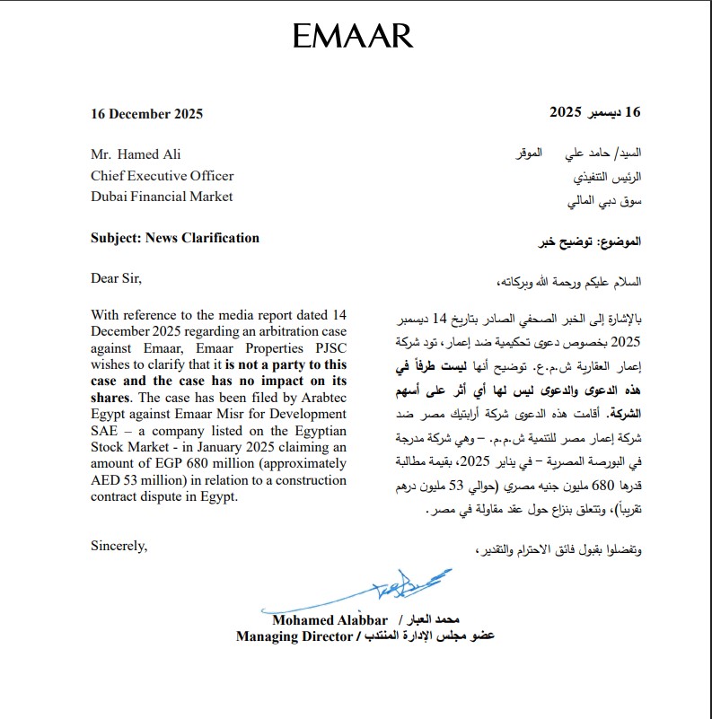 أكدت شركة إعمار العقارية المدرجة في سوق دبي المالي، أنها ليست طرفا في دعوى التحكيم المقامة ضد شركة إعمار مصر للتنمية، والتي أعلن عنها يوم الأحد الماضي.