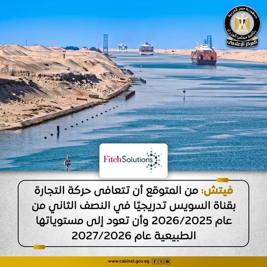 أكدت وكالة «فيتش» للتصنيف الائتماني أن حركة التجارة الملاحية عبر قناة السويس مرشحة لتحقيق تعافٍ تدريجي خلال النصف الثاني من العام المالي 2025/2026، في أعقاب وقف إطلاق النار في غزة، متوقعة أن تعود حركة السفن إلى مستوياتها الطبيعية التي سبقت الحرب خلال العام المالي 2026/2027.