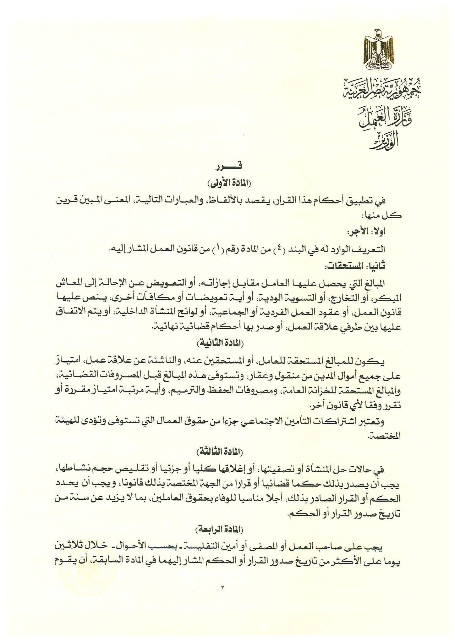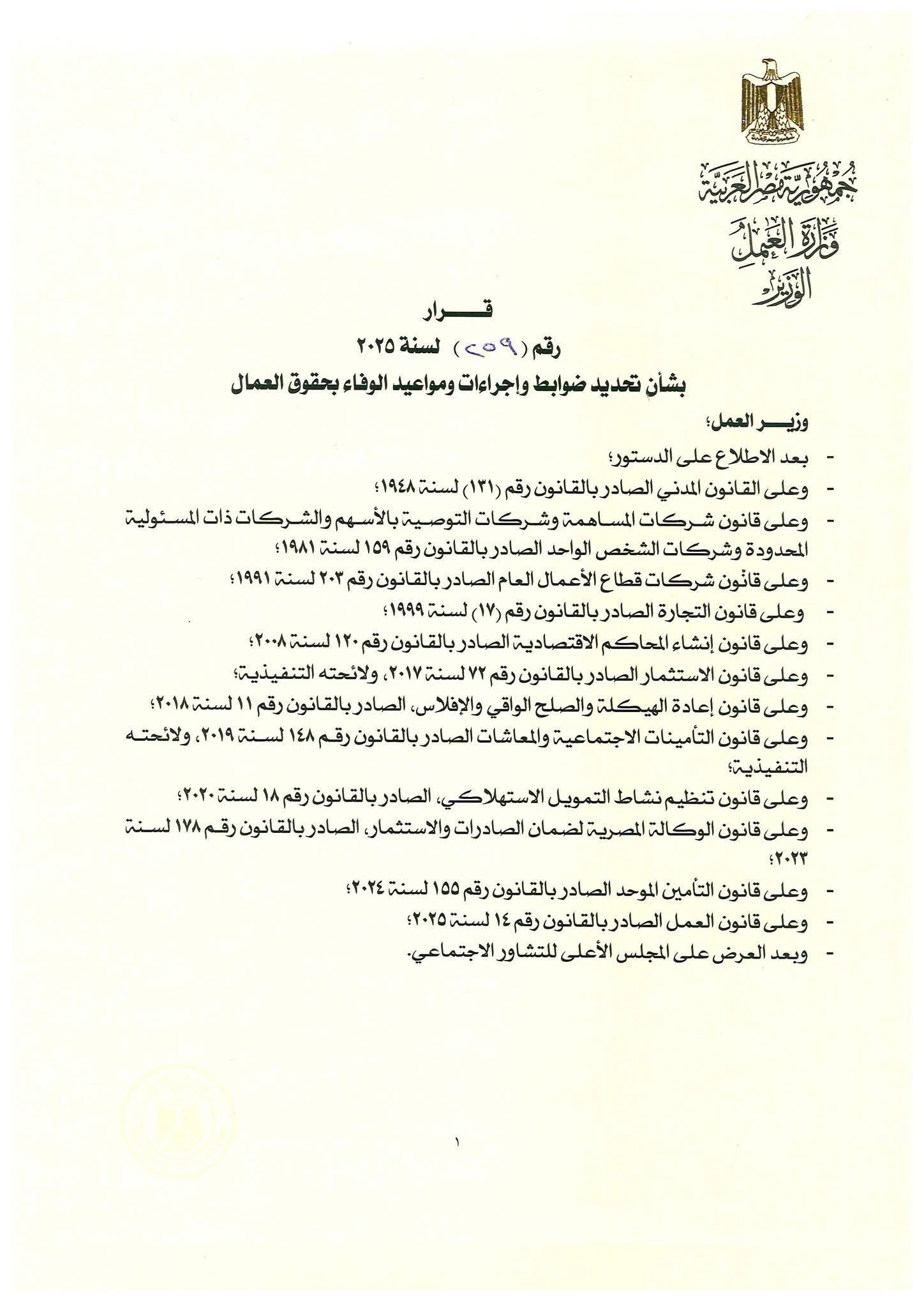 وزير العمل يصدر قرارًا وزاريًا رقم (259) لسنة 2025 بشأن مواعيد وضوابط الوفاء بحقوق العمال عند حل أو تصفية أو إغلاق المنشآت