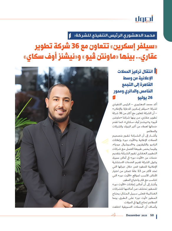 أكد محمد الدهشوري – الرئيس التنفيذي لشركة «سيلفر إسكرين للدعاية والإعلان» – أن الشركة تتعاون مع أكثر من 36 شركة تطوير عقاري، من بينها شركتا «ماونتن ڤيو» و«نيشنز أوف سكاي»، كما تقدم خدماتها لعملاء من أكبر البنوك والشركات والمطاعم.