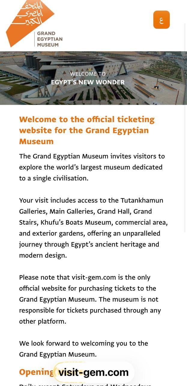 ومن جانبه، أشار الدكتور أحمد غنيم الرئيس التنفيذي لهيئة المتحف المصري الكبير، إلى أن الموقع الإلكتروني الرسمي والوحيد المعتمد لشراء تذاكر زيارة المتحف المصري الكبير هو (visit-gem.com) فقط، مؤكدًا أنه لا توجد أي مواقع إلكترونية أخرى مخولة أو معتمدة لبيع التذاكر أو تقديم خدمات الحجز الخاصة بالمتحف.