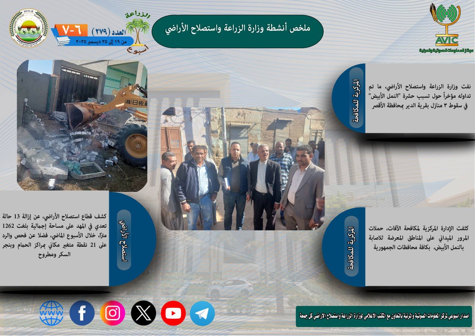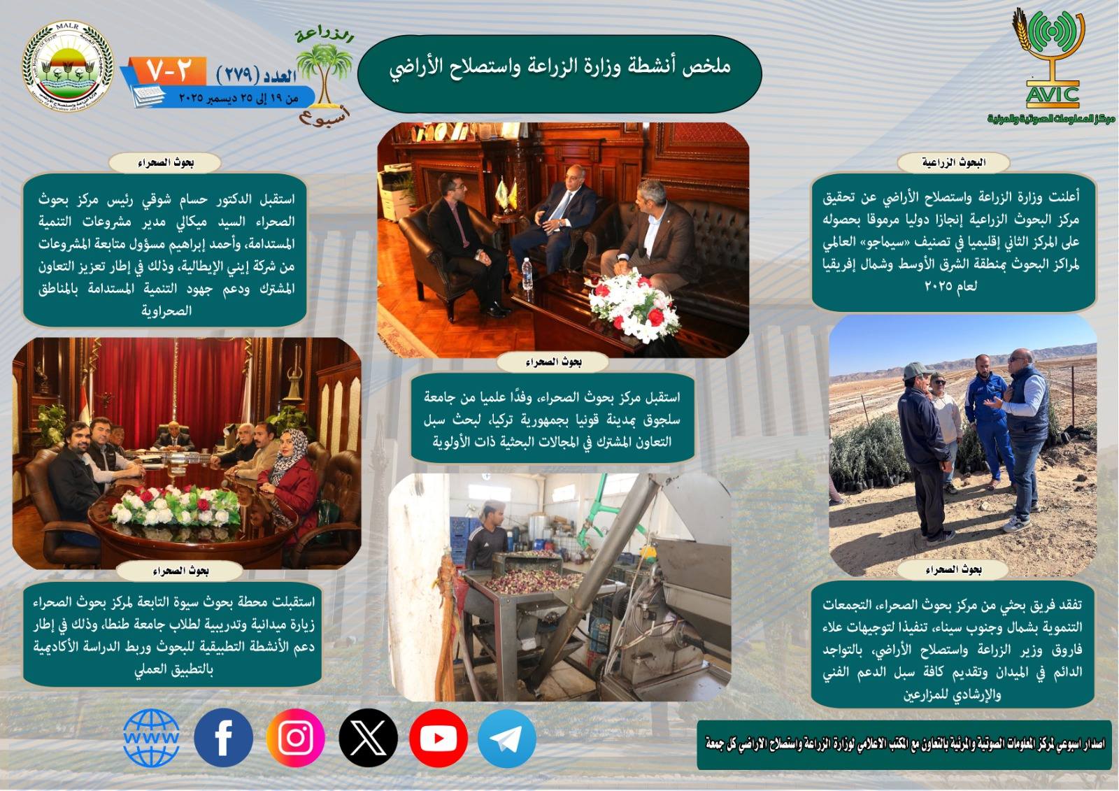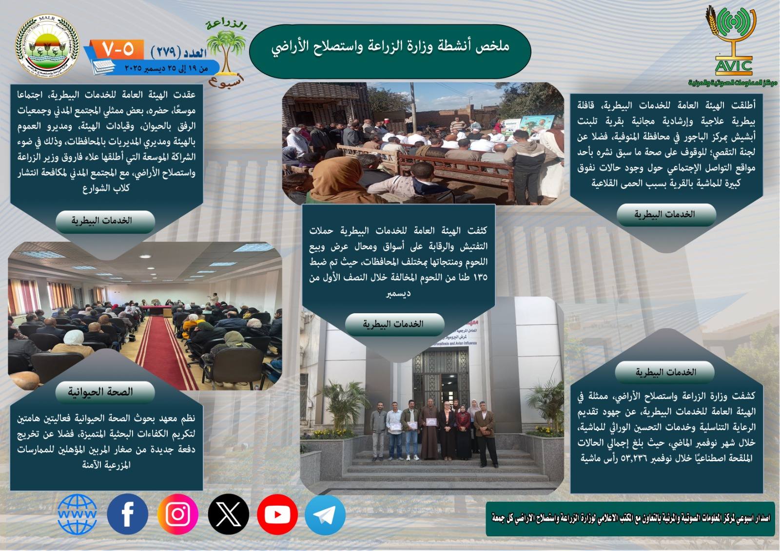 أصدر مركز المعلومات الصوتية والمرئية بوزارة الزراعة واستصلاح الأراضي، "الانفوجراف الاسبوعي" في نسخته رقم 279 حول الحصاد الاسبوعي لأهم أنشطة الوزارة، خلال الاسبوع الماضي في الفترة من 19 وحتى 25 ديسمبر الجاري، كما أصدر المركز ايضا ملخصا بالفيديو، حول انشطة الوزارة خلال نفس الفترة.