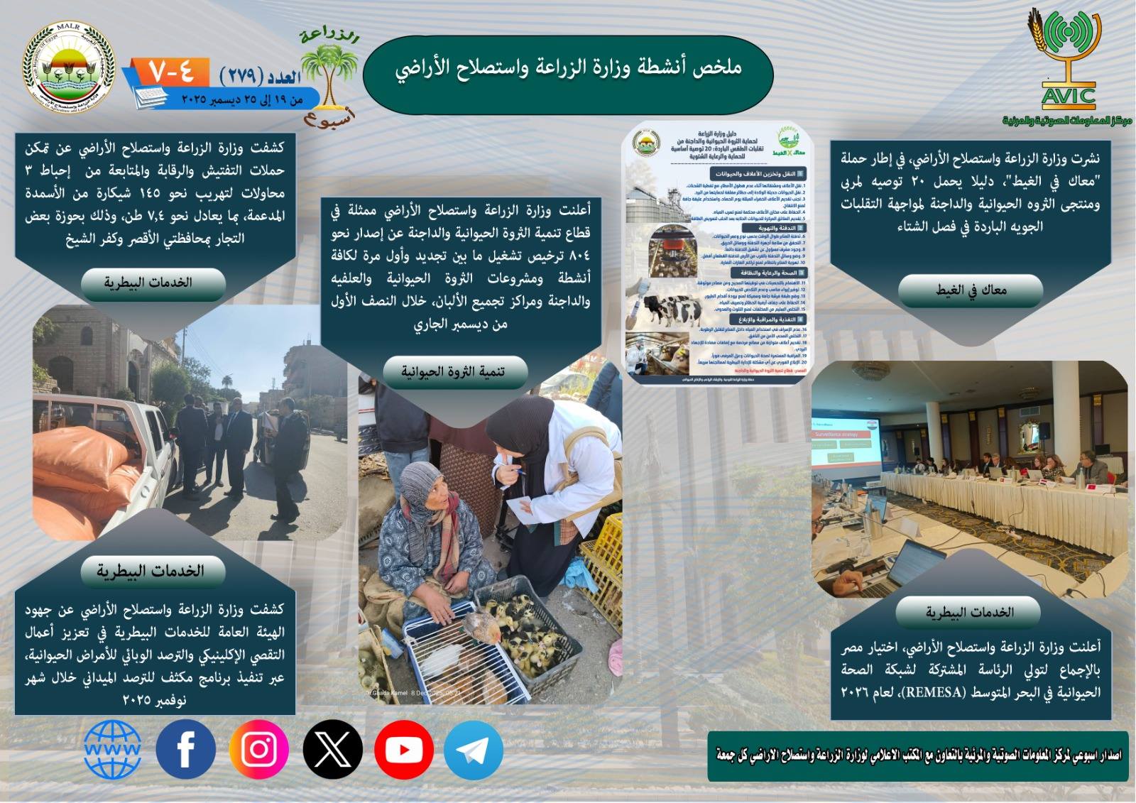 وأعلنت وزارة الزراعة واستصلاح الأراضي، اختيار مصر بالإجماع لتولي الرئاسة المشتركة لشبكة الصحة الحيوانية في البحر المتوسط (REMESA)، لعام 2026، كما كشفت الهيئة العامة للخدمات البيطرية في تعزيز أعمال التقصي الإكلينيكي والترصد الوبائي للأمراض الحيوانية، عبر تنفيذ برنامج مكثف للترصد الميداني خلال شهر نوفمبر، كما أطلقت قافلة بيطرية علاجية وإرشادية مجانية بقرية تلبنت أبشيش بمركز الباجور في محافظة المنوفية، فضلا عن لجنة التقصي؛ للوقوف على صحة ما سبق نشره بأحد مواقع التواصل الإجتماعي حول وجود حالات نفوق كبيرة للماشية بالقرية بسبب الحمى القلاعية، كذلك عقدت اجتماعا موسعًا، حضره، بعض ممثلي المجتمع المدني وجمعيات الرفق بالحيوان، وقيادات الهيئة، ومديرو العموم بالهيئة ومديري المديريات بالمحافظات، وذلك في ضوء الشراكة الموسعة التي أطلقها علاء فاروق وزير الزراعة واستصلاح الأراضي، مع المجتمع المدني لمكافحة انتشار كلاب الشوارع