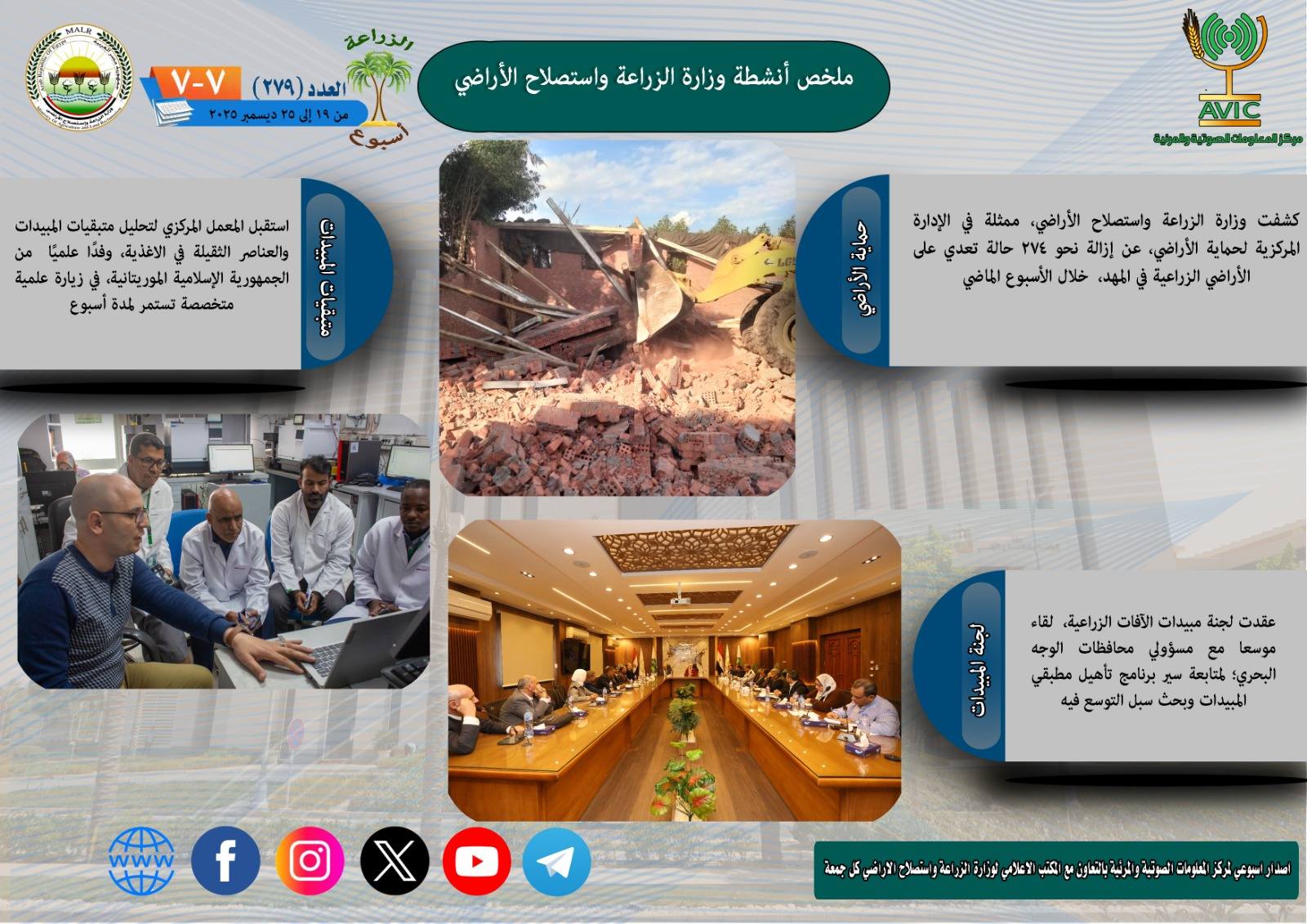 يذكر ان مركز المعلومات الصوتية والمرئية، والمكتب الاعلامي للوزارة، يصدران الجمعة من كل اسبوع، انفوجرافا وفيديو باسم: الزراعة في اسبوع، لالقاء الضوء على ملخص ما تم من انشطة وجهود، بكافة القطاعات والهيئات، التابعة للوزارة، فضلا عن انفوجراف وفيديو كل ثلاثاء ب