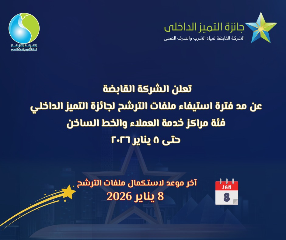 تعلن الشركة القابضة لمياه الشرب والصرف الصحي عن مد فترة استيفاء وتقديم ملفات الترشح لجائزة التميز الداخلي لفئة مراكز خدمة العملاء والخط الساخن، وذلك حتى 8 يناير 2026.