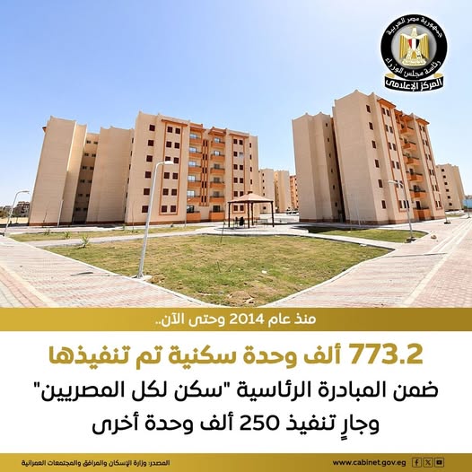 أعلنت وزارة الإسكان والمرافق والمجتمعات العمرانية عن تنفيذ نحو 773.2 ألف وحدة سكنية ضمن المبادرة الرئاسية «سكن لكل المصريين» منذ انطلاقها عام 2014، في إطار جهود الدولة المستمرة لتوفير سكن ملائم للمواطنين من محدودي ومتوسطي الدخل.