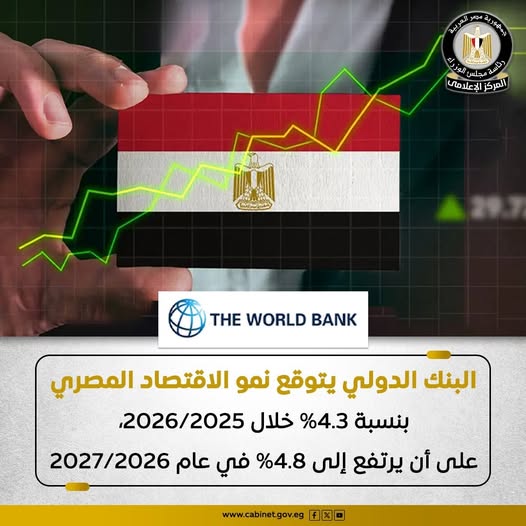 وفقًا لتقديرات البنك الدولي، يُتوقع أن يشهد الاقتصاد المصري تحسنًا في معدلات النمو خلال الفترة المقبلة، إذ يُرجّح أن يتعزز النمو ليبلغ 4.6% سنويًا في المتوسط خلال العامين الماليين 2026/2025 و2027/2026، مدفوعًا بقوة صافي الصادرات.