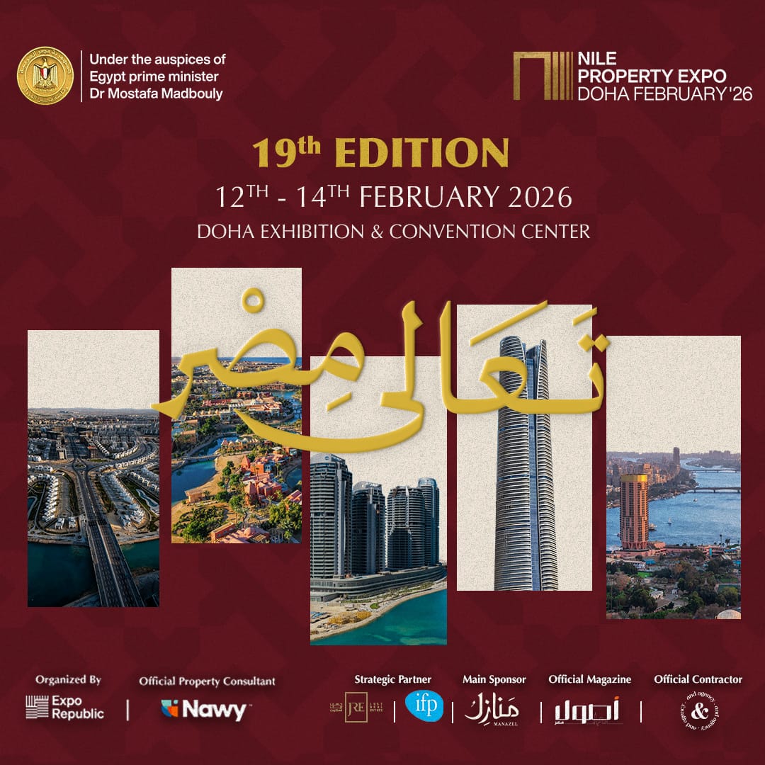 وتنطلق النسخة الـ 19 من معرض عقارات النيل- Nile Property Expo فى الفترة من 12 الى 14 فبراير 2026 فى مركز الدوحة للمعارض والمؤتمرات بمشاركة أكبر 20 شركة تطوير عقاري فى مصر والشرق الأوسط ، تقدم مجموعة متنوعة من المشروعات السكنية والاستثمارية التي تلبي تطلعات السوق القطرية والطلب المتنامي على العقارات المصرية.