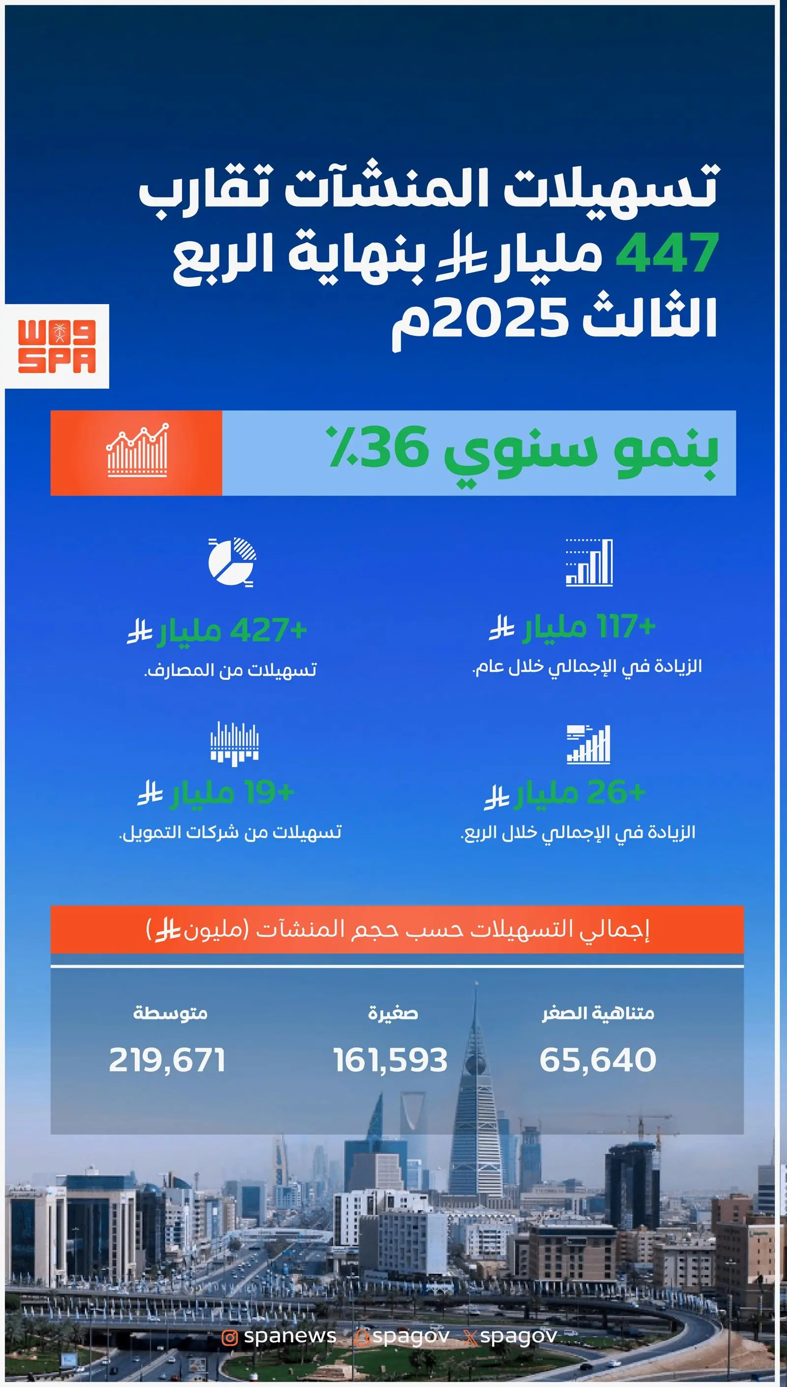 سجّل إجمالي التسهيلات الائتمانية المقدَّمة من قطاعي المصارف وشركات التمويل للمنشآت المتوسطة والصغيرة ومتناهية الصغر نموًا قويًا، ليبلغ أعلى مستوياته التاريخية عند نحو 446.9 مليار ريال بنهاية الربع الثالث من عام 2025، محققًا نموًا سنويًا بنسبة 36%، وبزيادة قدرها 117.7 مليار ريال مقارنة بالفترة المماثلة من عام 2024 التي بلغ فيها إجمالي التسهيلات 329.2 مليار ريال.