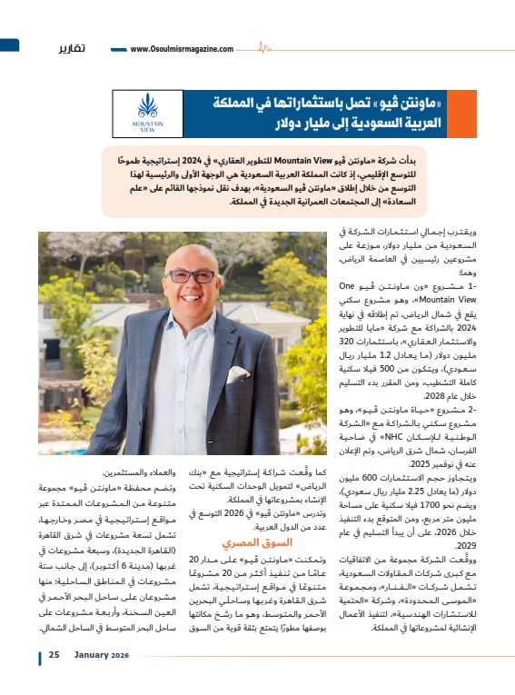 بدأت شركة «ماونتن ڤيو Mountain View للتطوير العقاري» في 2024 إستراتيجية طموحًا للتوسع الإقليمي، إذ كانت المملكة العربية السعودية هي الوجهة الأولى والرئيسية لهذا التوسع من خلال إطلاق «ماونتن ڤيو السعودية»، بهدف نقل نموذجها القائم على «علم السعادة» إلى المجتمعات العمرانية الجديدة في المملكة.