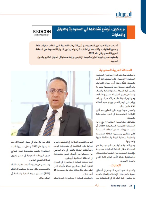 أصبحت شركة «ريدكون للتعمير» من أولى الشركات المصرية التي اتخذت خطوات جادة بتصدير المقاولات، وذلك بعد أن أطلقت شركتها «ريدكون الدولية المحدودة» في المملكة العربية السعودية في عام 2023.
