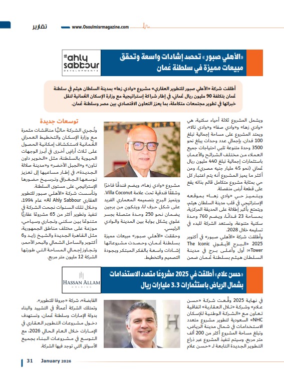 وحققت «الأهلي صبور» مبيعات مميزة بسلطنة عُمان، وحصدت مشروعاتها إشادات واسعة بالفكر المبتكر وبجودة التصميم والتخطيط.
